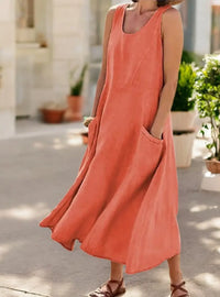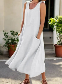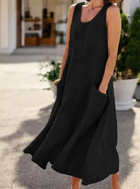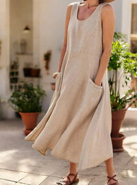 Blijf koel dit seizoen in deze mouwloze jurk, ontworpen om moeiteloos te dragen in de zomer. Gemaakt van een lichtgewicht katoen-linnen mix, houdt het je comfortabel op warme dagen terwijl het een ontspannen, ademende pasvorm biedt. Het losse ontwerp met o-hals geeft je de hele dag gemak, terwijl de steekzakken een praktisch tintje geven. Of je nu boodschappen doet, naar het strand gaat of thuis luiert, deze veelzijdige vestjurk is een must-have voor casual dagen. Combineer het met sandalen en een strooien hoed voor een relaxte zomerlook.