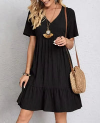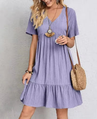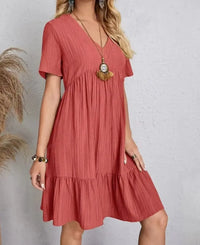 Deze kanten zomerjurk is ontworpen om je taille te accentueren en is jouw go-to voor zomerse uitstapjes. De lichte stof, ontspannen pasvorm en ruches aan de zoom zorgen samen voor een evenwichtig silhouet dat elk lichaamstype flatteert. De v-halslijn voegt een modern randje toe, waardoor het gemakkelijk de overgang maakt van een casual middag naar een gekleed diner. Dit is de ideale warmweerjurk voor vakantie, lunch of een weekendje weg. Stijl het met sleehakken en een geweven crossbody tas om de look af te maken.Luna Dames Vakantie Veter Mini Zomerjurk VIQA© NEDERLAND
