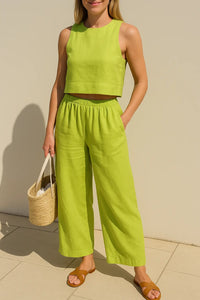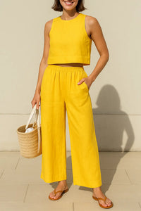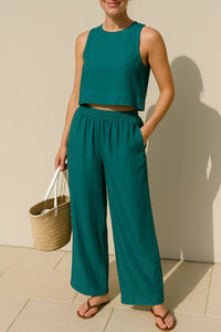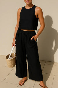 Trek deze luchtige tweedelige set aan die is ontworpen voor comfort, beweging en moderne stijl. De lichtgewicht mouwloze top combineert met een wijde broek met wijde pijpen, waardoor een gepolijst en toch ontspannen silhouet ontstaat dat je de hele dag koel houdt. Of je nu gaat brunchen of naar kantoor gaat, deze outfit is gemakkelijk te combineren. Gemaakt voor dames die waarde hechten aan eenvoud, zelfvertrouwen en comfort in één. Het is de outfit zonder moeite die eruit ziet alsof je het geprobeerd hebt. Stijl het met minimalistische sandalen en een crossbody tas voor de perfecte alledaagse look.Damesset 2-Delig Zomer, Mouwloos Los Overhemd En Wijde Broek, Casual Effen Kleurenoutfit | VIQA VIQA© NEDERLAND