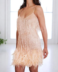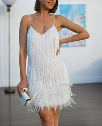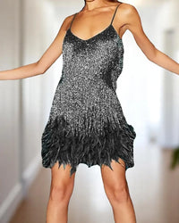 Met oogverblindende pailletten, opvallende kwastjes en zachte veren levert dit jurkje een opvallende stijl in een gestroomlijnd silhouet. Of je nu een entree maakt op een feestje of de show steelt op het schoolbal, deze jurk zorgt ervoor dat je niet onopgemerkt blijft. De glanzende afwerking en de gebeeldhouwde snit flatteren je figuur en houden je de hele avond comfortabel. Combineer hem met hakken met riempjes en een chique clutch om de look compleet te maken. Dames Luxe Feestjurk Met Spaghettibandjes VIQA© NEDERLAND