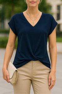 Upgrade je zomergarderobe met deze los-fit V-hals top ontworpen voor moeiteloos comfort en stijl. Het kreukvrije ontwerp en de ademende stof zorgen dat je er fris uitziet, zelfs op de warmste dagen. Het gekruiste plooidetail voegt een unieke touch toe en geeft het een chique en toch casual uitstraling. Deze top is perfect om elke dag te dragen en gaat naadloos over van een ontspannen dagje uit naar casual avonden. Combineer hem met een denim short of een lichte linnen broek om je zomerse look compleet te maken.Dames Zomer V-Hals Top, Los Fit Korte Mouwen Geplooid Tee, Effen Kleur Ademend Shirt | VIQA VIQA© NEDERLAND