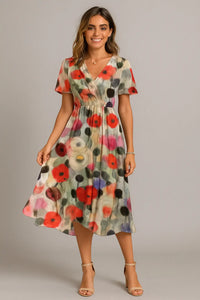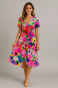 Deze elegante zomer midi-jurk met bloemen combineert moeiteloos comfort en seizoensstijl in één gemakkelijk stuk. Ontworpen met een flatterende v-hals en luchtige korte mouwen, is hij perfect voor warme lente- en zomerdagen. Het losse silhouet zorgt voor ademend bewegen terwijl het toch een vrouwelijke, ontspannen vorm geeft. Ideaal voor casual uitjes, brunches of spontane dagtripjes. Draag hem met espadrilles en een geweven tas voor een complete warm-weer-look.Ella Dames Elegant Zomer Midi Jurk Met V-Hals VIQA© NEDERLAND