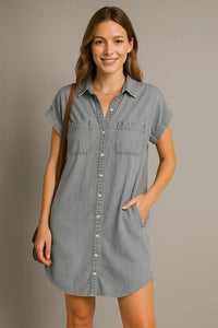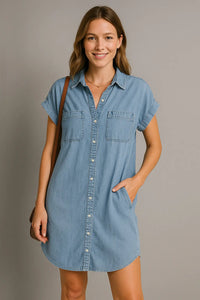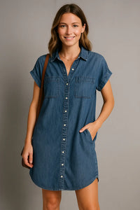 Blijf cool en zelfverzekerd dit seizoen in onze coole denim overhemdjurk - een garderobebehoefte voor moeiteloze dagelijkse styling. Ontworpen met een losse pasvorm en zakken aan de voorkant, biedt het gemakkelijke beweging en tijdloze charme. Of je nu naar kantoor gaat of geniet van een casual dagje uit, dit stuk geeft je look een relaxte maar toch gepolijste uitstraling. De zachte denimstof en het retro-silhouet creëren een veelzijdige outfitbasis voor warm weer. Combineer het met sneakers, een crossbody tas en minimalistische sieraden voor een frisse, moderne afwerking.Evelyn Dames Denim Mini Jurk Met Zakken VIQA© NEDERLAND
