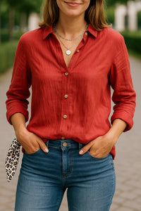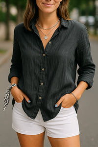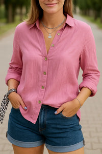 Stap in een moeiteloze stijl met deze casual loose-fit katoenen blouse, ontworpen voor warm weer. De ademende katoenen stof en ontspannen snit houden je de hele dag koel en comfortabel. De omgeslagen kraag en lange mouwen geven het een gepolijst accent, waardoor het perfect is voor zowel relaxte uitjes als kantoorlooks. Dit lichtgewicht shirt combineert eenvoud met een tijdloos design, perfect voor de overgang tussen lenteochtenden en zomeravonden. Combineer het met een denim short, linnen broek of vloeiende midi rok voor een easygoing, chique outfit.