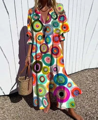 Ga voor een moeiteloze stijl met deze boho overhemdjurk met V-hals en enkele knopen, ontworpen voor relaxte dagen en dromerige uitjes. De lichte vloeiing en opvallende print zorgen voor een ontspannen charme die werkt van vergaderingen tot strandwandelingen. Met zijn losse pasvorm en vloeiende zoomlijn beweegt deze jurk met je mee op de juiste manier. De button-down voorkant voegt structuur toe, terwijl het speelse patroon het zorgeloos houdt. Een must-have voor zowel je vakantiegarderobe als je dagelijkse gemak. Combineer hem met sandalen, een geweven tas en een oversized zonnebril voor de perfecte warm weer look.Lorna Dames Boho Overhemd Maxi Jurk Met Knoopsluiting VIQA© NEDERLAND