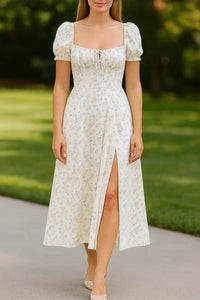 Midi-jurk In Korsetstijl, Bloemige Pofmouwen Met Vierkante Hals, Geplooide Striksluiting En Zwierige Pasvorm | VIQA